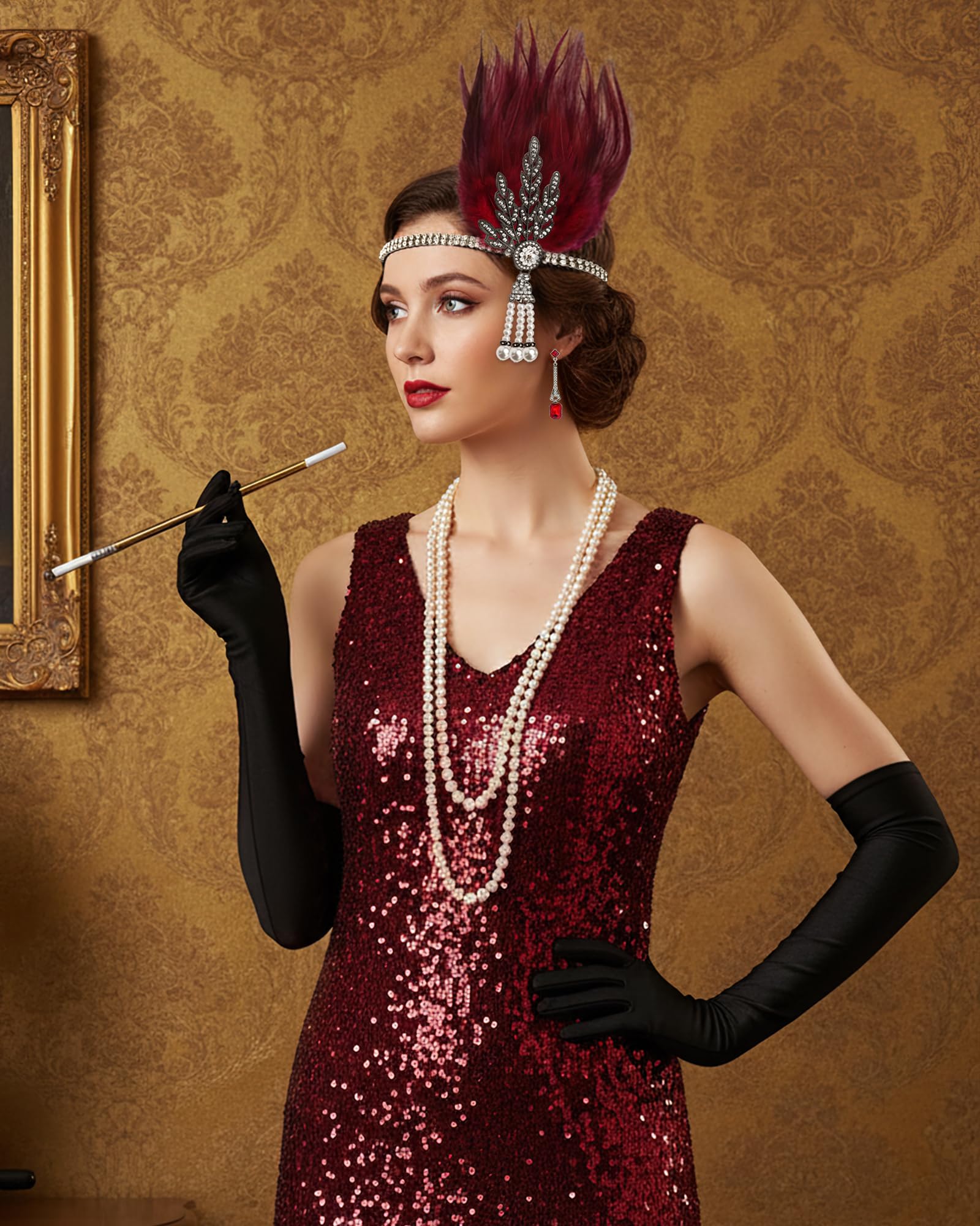 - 1920s Accessories for Women: You will receive 1 feather headband, 1 pearl necklace, 1 pair of 20s earrings, 1 pair of long gloves, they will help you create a retro glamorous look