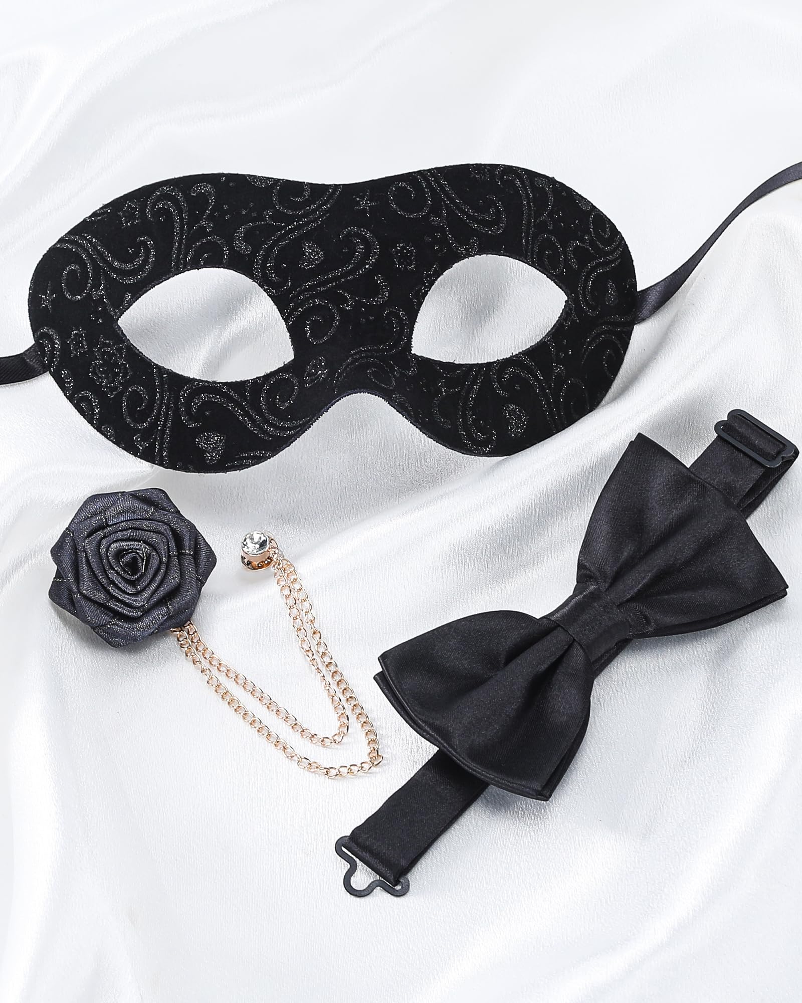 - Men's Masquerade Set: This 3-piece masquerade set for men includes a fabric half-face mask, a stylish bow tie, and a rose lapel brooch. Everything you need for a sharp, sophisticated look, all in one set—no extra accessories required
