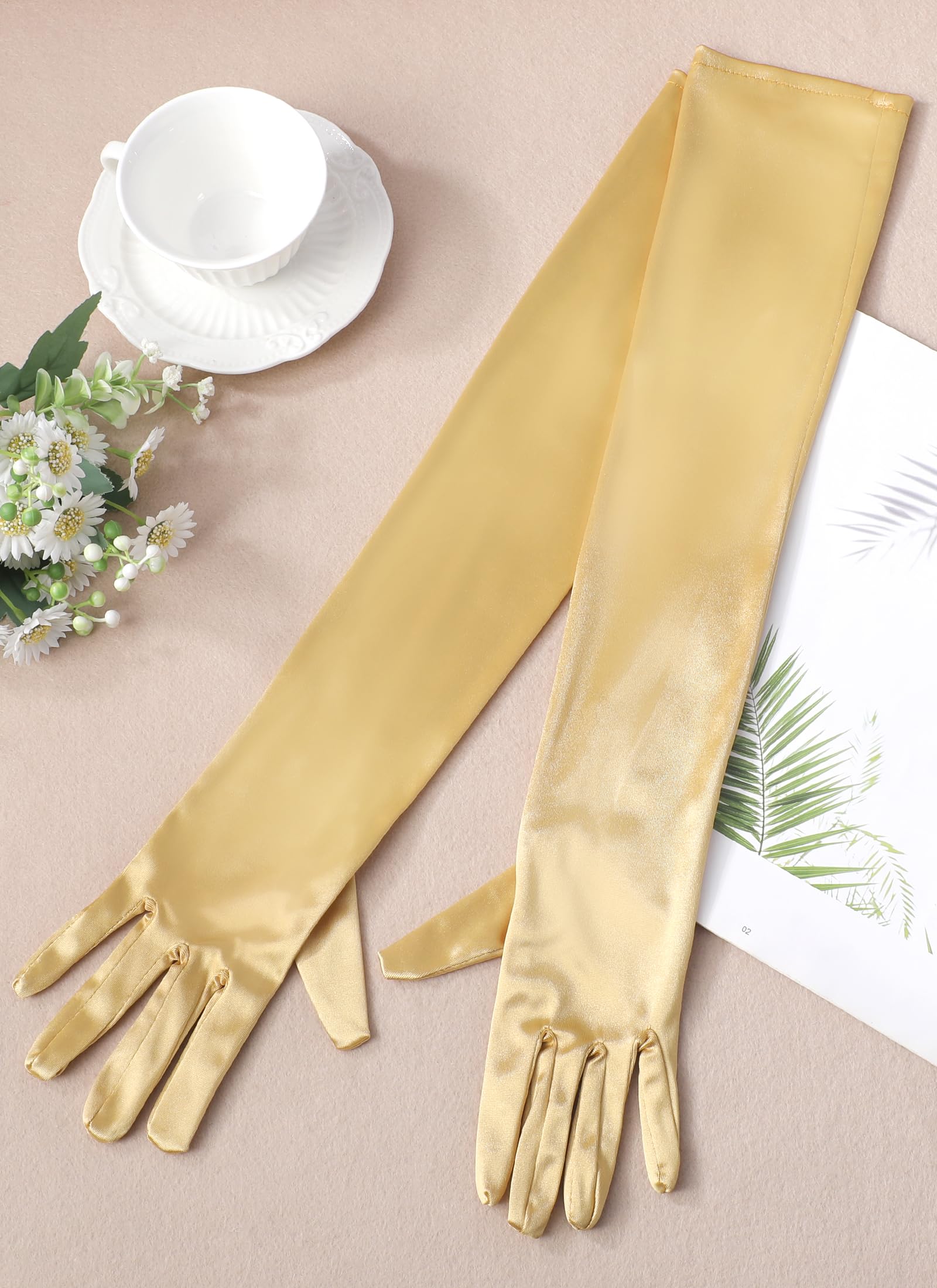 - Elegant Length: These satin gloves feature an elegant elbow-length design of approximately 55cm (21.65 inches), offering timeless sophistication and graceful arm coverage. The moderate stretch allows a snug yet flexible fit for most adult hand sizes (palm width 8–13cm), though not recommended for wider hands