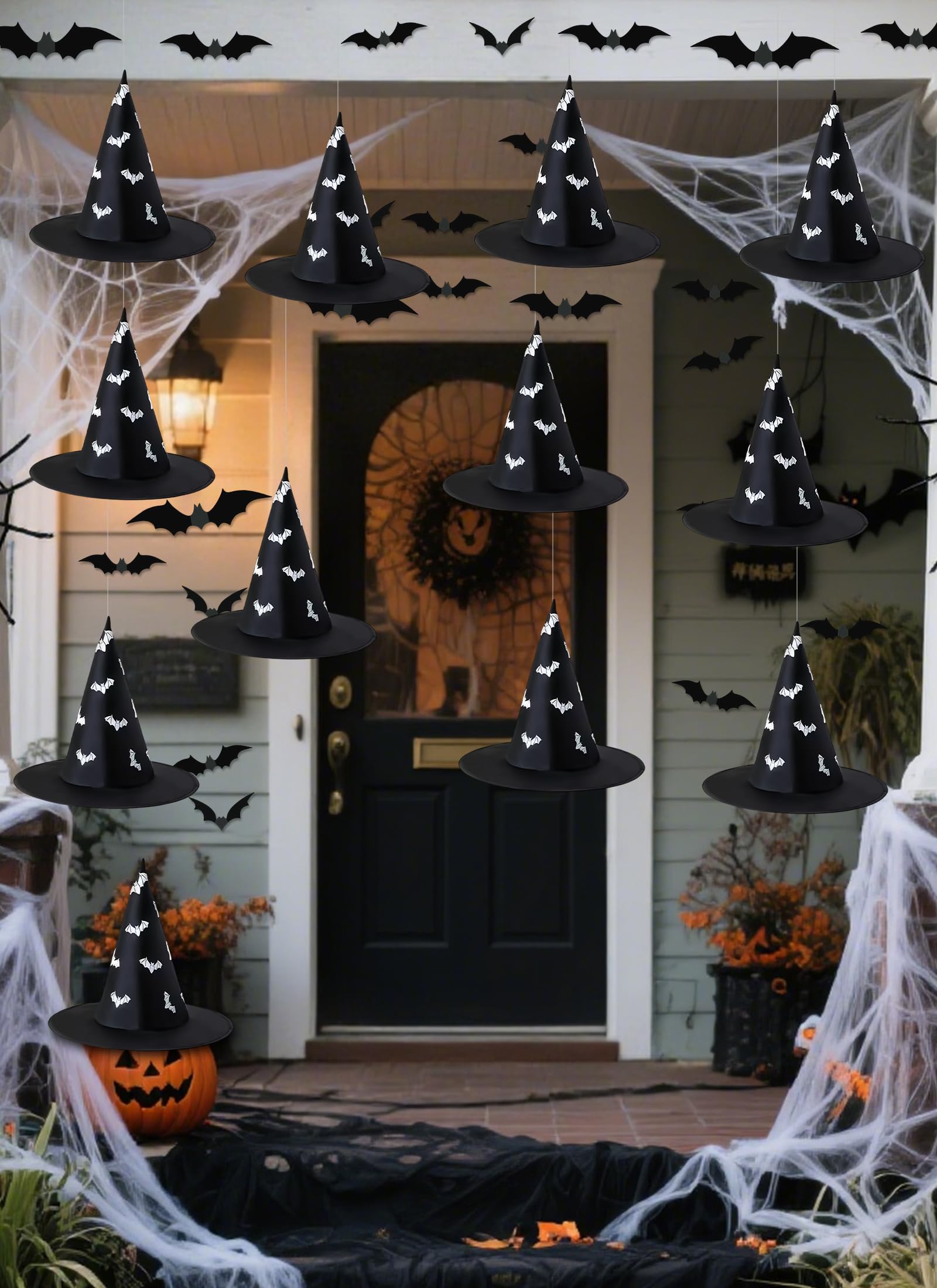 - Package Includes: This is a witch decoration. You will receive 8 black witch hats, 1 roll of fishing line (108 feet), and 24 bat wall decals—a fun and spooky Halloween party decoration set that’s perfect for haunted house setups, trick-or-treat events, or carnival nights
